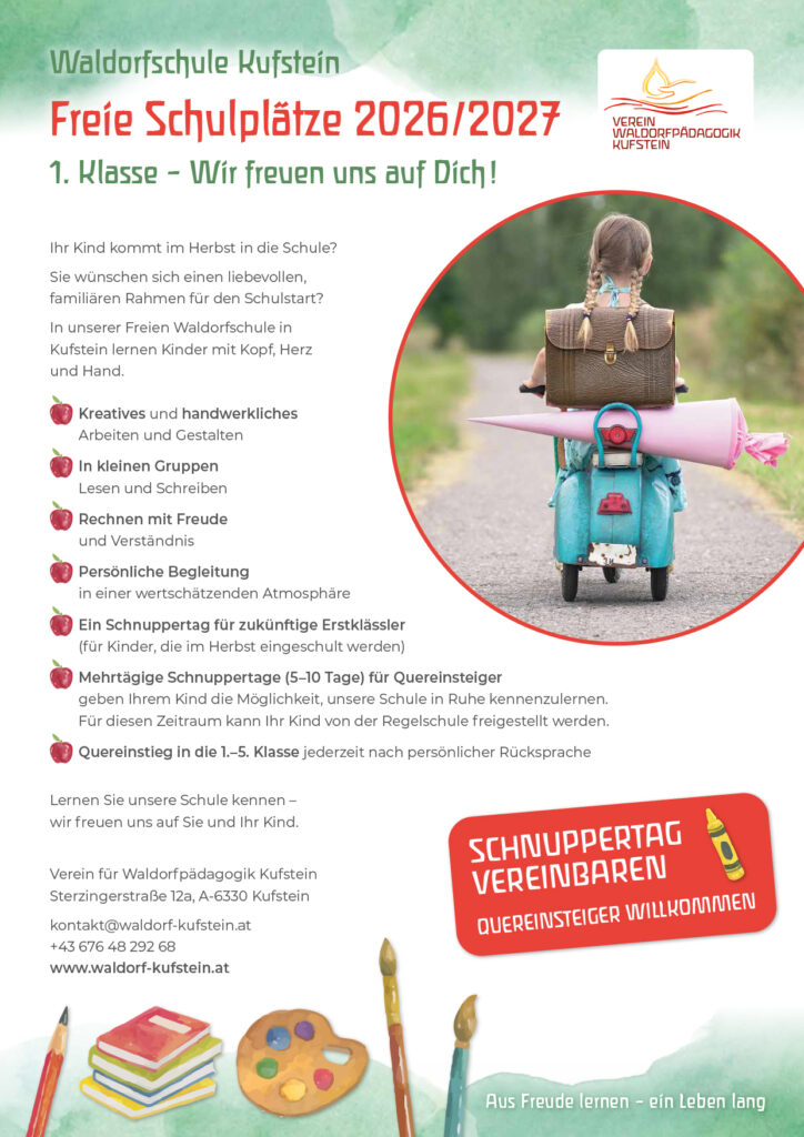 Nutzt für Anmeldungen, Fragen und Terminvereinbarungen gerne das Online-Kontaktformular oder meldet Euch per E-Mail an kontakt@waldorf-kufstein.at oder telefonisch unter +43 676 482 92 68.